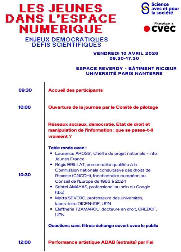 La montée en puissance des plateformes numériques transforme profondément les conditions de production, de circulation et de légitimation des savoirs, tout en redéfinissant les modalités d’exercice de la citoyenneté démocratique. Le Comité de pilotage du « Jeunes HUB », dispositif participatif de l’Université Paris Nanterre, développé dans le cadre des actions « Science avec et pour la société », organise sa journée autour du thème : « Les jeunes dans l’espace numérique : enjeux démocratiques et défis scientifiques ».