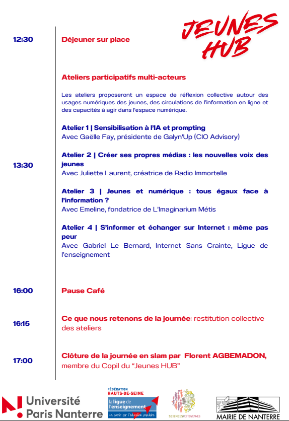 Les personnes intéressées peuvent également découvrir les éditions précédentes du Jeunes HUB sur la chaîne YouTube de l’Université Paris Nanterre, qui présente les échanges et les initiatives portées par ce dispositif participatif.